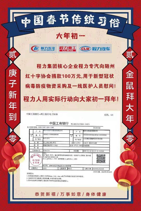 導讀:湖北程力集團向隨州市紅十字會捐贈人民幣100萬元,用于抗擊新冠肺炎疫情。此外,該公司正在抓緊調配設備,趕制負壓救護車,助力早日打贏這場沒有硝煙的戰爭。“各…
