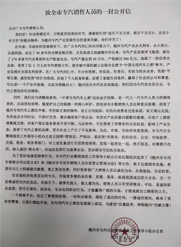 湖北隨州專汽銷售行業整頓公開信,誠信為本從我做起合法經營