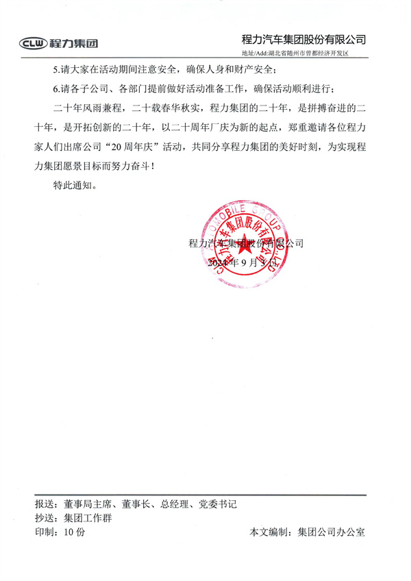 關(guān)于程力集團二十周年廠慶的通知 尊敬的程力家人們: 時光荏苒,歲月如梭。在這個秋高氣爽,充滿希望與收獲的季節(jié)里,程力集團即將迎來二十周年廠慶,為了慶祝這一具有重大意義的時刻,集團公司決定舉辦一系列豐富多彩的慶典活動,活動詳情如下: 一、活動時間 9月15日(全天),8:30-23:58。 二、活動地點 曾都經(jīng)濟開發(fā)區(qū)程力集團(新廠)程力大舞臺 ![]() 三、活動內(nèi)容 1.舉辦盛大的慶祝儀式,回顧程力集團二十年的發(fā)展歷程,表彰為集團發(fā)展做出突出貢獻的員工; 2.開展新LOGO、廠歌發(fā)布,展示程力集團的新品牌和企業(yè)文化; 3.邀請專家學者舉辦專用汽車專題報告和新能源、應(yīng)急裝備、國際貿(mào)易分論壇,探討專用汽車行業(yè)的發(fā)展趨勢和未來前景; 4.組織員工文藝匯演,展現(xiàn)程力人的風采和精神風貌。 四、注意事項 1.憑票入場; 2.參會人員上午統(tǒng)一著20周年藍色T恤衫入場,參加晚會的,統(tǒng)一著20 周年紀念版白色T恤衫入場參與晚會互動; 3.參加活動的人員請遵守活動現(xiàn)場的秩序,聽從工作人員的安排,遵守會場的紀律; 4.參會人員不得中途退場; 5.請大家在活動期間注意安全,確保人身和財產(chǎn)安全; 6.請各子公司、各部門提前做好活動準備工作,確保活動順利進行; 二十年風雨兼程,二十載春華秋實,程力集團的二十年,是拼搏奮進的二十年,是開拓創(chuàng)新的二十年,以二十周年廠慶為新的起點,鄭重邀請各位程力家人們出席公司“20周年慶”活動,共同分享程力集團的美好時刻,為實現(xiàn)程力集團愿景目標而努力奮斗! 特此通知。 ![]() ![]() |