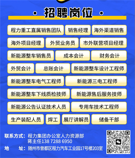 程力汽車集團2025年近期正在招聘多個職位,包括但不限于銷售、技工、工程師,新能源車型技術人員和海外銷售人員等。以下是一些具體的招聘信息: