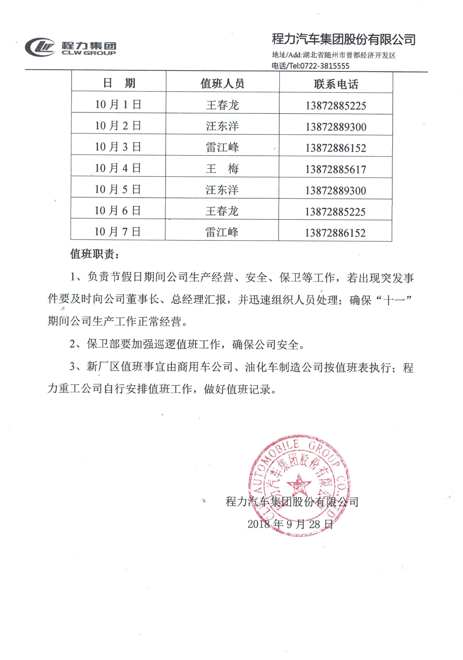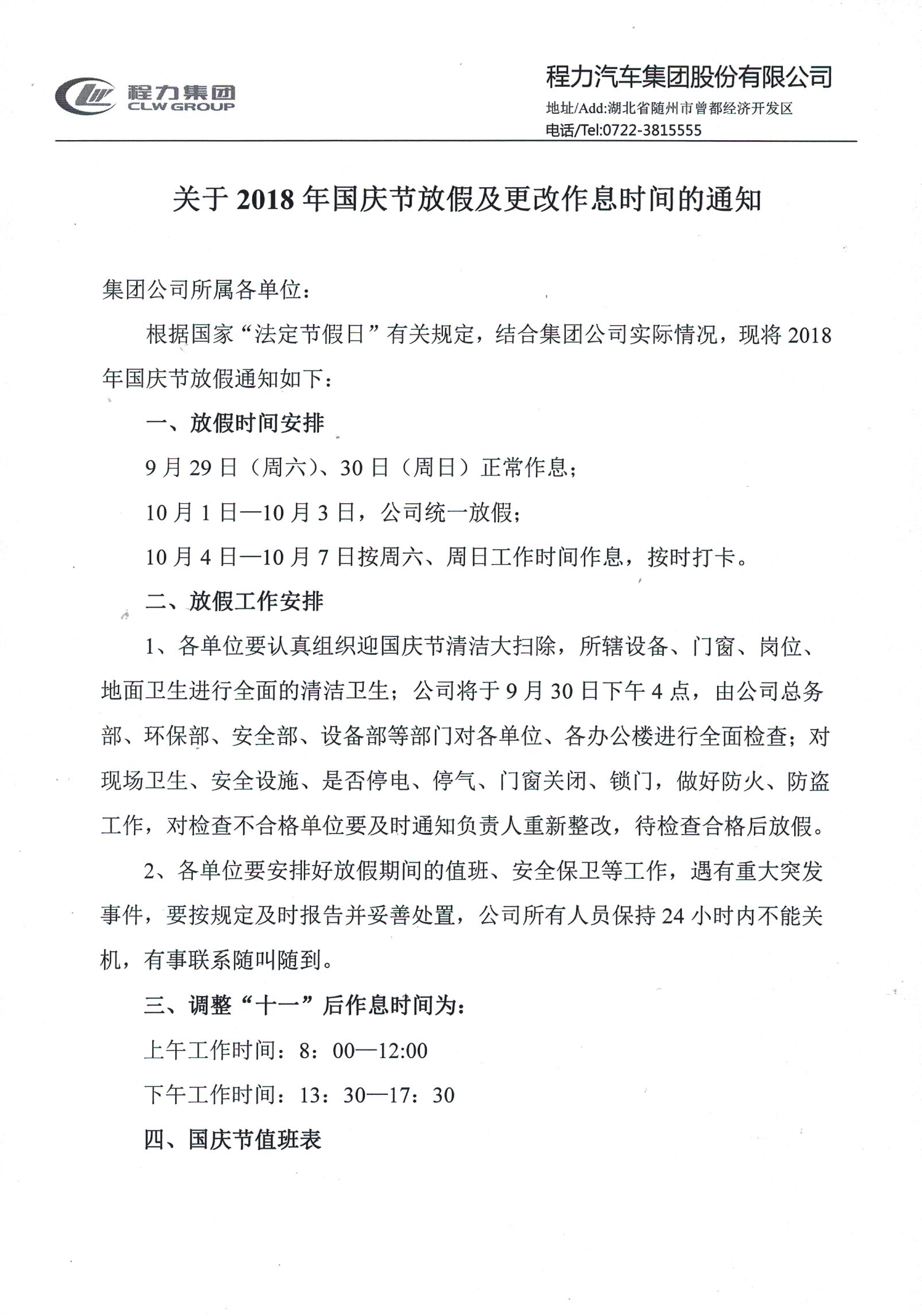 湖北程力公司2018年“國(guó)慶節(jié)”放假值班人員安排及更改作息時(shí)間的通知 : 公司各單位: 根據(jù)國(guó)家“法定節(jié)假日”有關(guān)規(guī)定,結(jié)合湖北程力公司實(shí)際情況,現(xiàn)將公司2018年國(guó)慶節(jié)放假通知如下: 一、放假時(shí)間安排 10月1日--10月3日,公司統(tǒng)一放假; 10月4日--10月7日按周六、周日工作時(shí)間休息。按時(shí)打卡 二、放假工作安排 1、衛(wèi)生檢查:各單位要認(rèn)真組織迎國(guó)慶節(jié)清潔大掃除,所轄設(shè)備、門窗、崗位、地面衛(wèi)生、進(jìn)行全面的清潔衛(wèi)生;公司將組織人員對(duì)各單位、各辦公樓進(jìn)行全面檢查;對(duì)檢查不合格單位“十一”不放假,要重新做衛(wèi)生,帶合格后放假。 2、安全保衛(wèi)工作:各車間和單位在放假下班前,要切斷用電設(shè)備電源、氣源、水源、鎖好門窗,徹底消除不安全隱患;由公司安全部、保衛(wèi)部組織檢查,發(fā)現(xiàn)有未關(guān)閉電氣設(shè)備及門窗的單位或個(gè)人,公司將按規(guī)定嚴(yán)肅處罰。 3、保持通訊:公司所有人員保持24小時(shí)內(nèi)不能關(guān)機(jī),有事聯(lián)系隨叫隨到,請(qǐng)各部門妥善安排好幾日期間的值班、安全、保衛(wèi)等工作。 三、“十一”后作息時(shí)間 上午工作時(shí)間:8:00--12:00 下午工作時(shí)間:13:30--17:30
