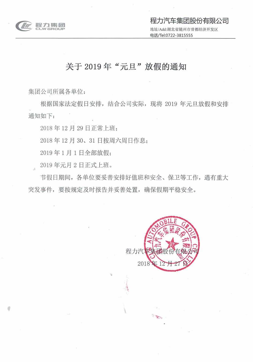| 湖北程力汽車集團2019年元旦放假通知: |