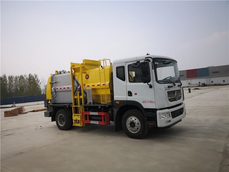 c、罐體容積8.5-10方,罐體帶舉升功能,后門液壓控制開啟關閉,帶液壓鎖緊功能,拉桿提升機聯動頂蓋完美設計,收集時滴水不漏。提升架可掛 120L/240L 標準塑料垃圾桶