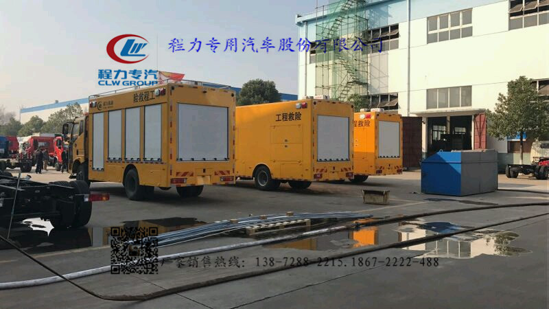 箱體:箱體外部鋼材為優(yōu)質(zhì)冷軋鋼板,內(nèi)襯優(yōu)質(zhì)冷軋鋼板折彎骨架,工藝先進,強度牢固。箱體為全密封結(jié)構(gòu),具備運輸,防雨,防腐,防火,防銹要求。車廂尾部安裝鋁合金卷簾門,發(fā)電機組進排風消聲處理,消聲器做降噪處理,車廂水泵兩側(cè)設(shè)開門,發(fā)電機進分口和排風口防雨百葉窗,工作門下,尾部設(shè)有隱藏式抽拉梯,與車廂底板框架連接。