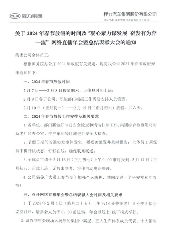 程力汽車集團(tuán)關(guān)于2024年春節(jié)放假的時(shí)間及”網(wǎng)絡(luò)直播年會(huì)暨總結(jié)表彰大會(huì)的通知