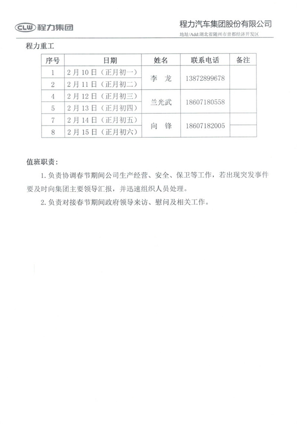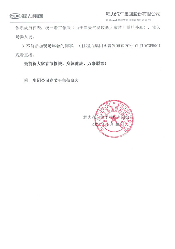 程力汽車集團(tuán)股份有限公司關(guān)于2024年春節(jié)放假的時(shí)間及“凝心聚力謀發(fā)展奮發(fā)有為奔 一流”網(wǎng)絡(luò)直播年會(huì)暨總結(jié)表彰大會(huì)的通知 程力集團(tuán)公司全體員工: 根據(jù)國(guó)務(wù)院辦公廳2024年放假有關(guān)規(guī)定,現(xiàn)將程力汽車集團(tuán)公司2024年春節(jié)放假安排通知如下: 一、2024年春節(jié)放假時(shí)間 2月7日--2月8日按星期六、日作息時(shí)間上班; 2月9日各子公司、職能部門根據(jù)工作需要安排人員值班; 2月10日(正月初一)一-2月15日(正月初六)放假,共六天。 二、2024年春節(jié)放假工作安排及相關(guān)要求 1.各單位、部門要做好節(jié)前安全檢查和清潔掃除工作,集團(tuán)綜合檢查組將對(duì) 新老廠區(qū)辦公室、生產(chǎn)車間等區(qū)域進(jìn)行安全大檢查。 2.節(jié)假日期間若遇突發(fā)事件發(fā)生,要妥善處置并及時(shí)報(bào)告;全體員工須保持手機(jī)開(kāi)機(jī)狀態(tài),釘釘在線,確保聯(lián)系暢通。 3.全體員工請(qǐng)于2月16日(正月初七)上午9:00準(zhǔn)時(shí)報(bào)到,2月17日(正月初八)正式上班,無(wú)故未到者,將作自動(dòng)離職處理。 4.公司倡導(dǎo)廣大員工春節(jié)期間加強(qiáng)個(gè)人防護(hù),共同度過(guò)一個(gè)平安祥和的春節(jié)! 三、召開(kāi)網(wǎng)絡(luò)直播年會(huì)暨總結(jié)表彰大會(huì)時(shí)間及相關(guān)要求 1.于2024年2月4日(臘月二十五)上午9:18分整在老廠6號(hào)樓2樓會(huì) 議室召開(kāi),請(qǐng)參會(huì)人員于8:50前進(jìn)場(chǎng),年會(huì)以線上+線下模式舉行。 2.請(qǐng)收到年會(huì)現(xiàn)場(chǎng)入場(chǎng)券的集團(tuán)中高層、五大生產(chǎn)體系成員代表、十大銷售體系成員代表,統(tǒng)一著工作服(由于當(dāng)天氣溫較低大家?guī)虾竦耐馓?,憑入 場(chǎng)券入場(chǎng)。 3.不能參加現(xiàn)場(chǎng)年會(huì)的同事,關(guān)注程力集團(tuán)抖音發(fā)布官方號(hào):CLJTDYGFH001 觀看直播。 提前祝大家春節(jié)愉快、身體健康、萬(wàn)事順意!附圖: ![]() ![]() ![]() ![]() |